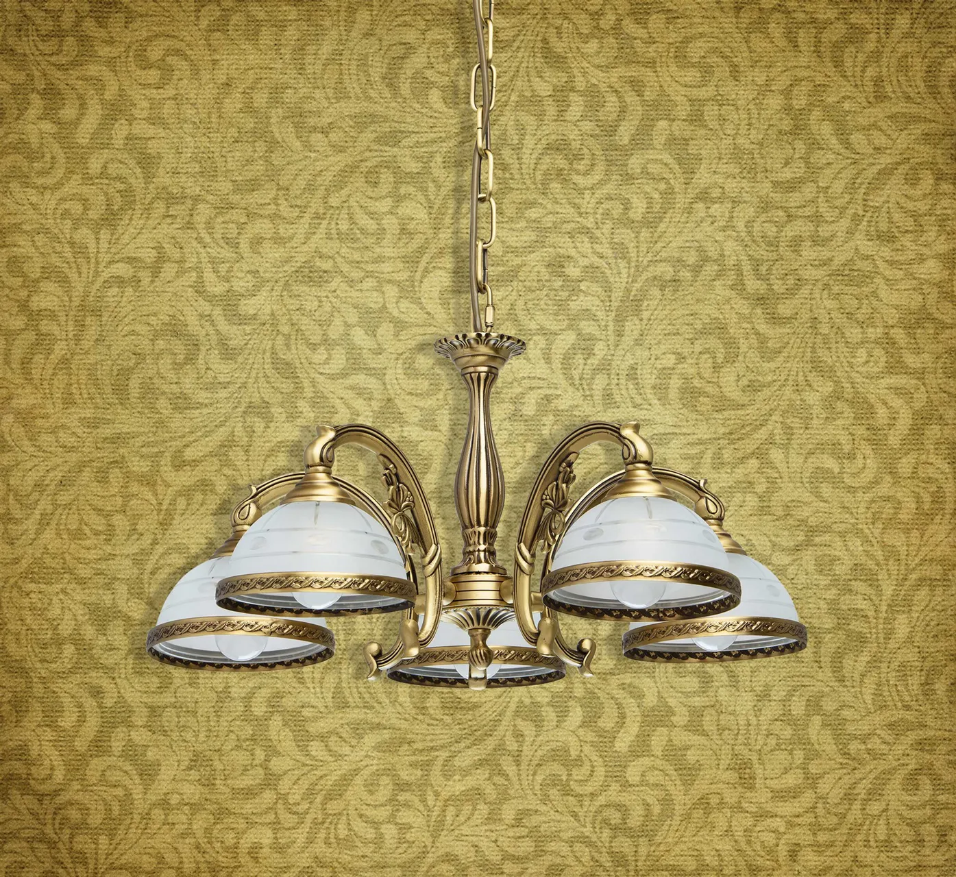 Основание из латуни, стеклянные плафоны с резным узором.