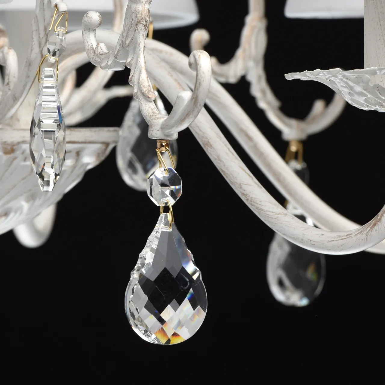 Металлическое основание окрашено в белый цвет с золотистой патиной. Абажуры - текстиль белого цвета.